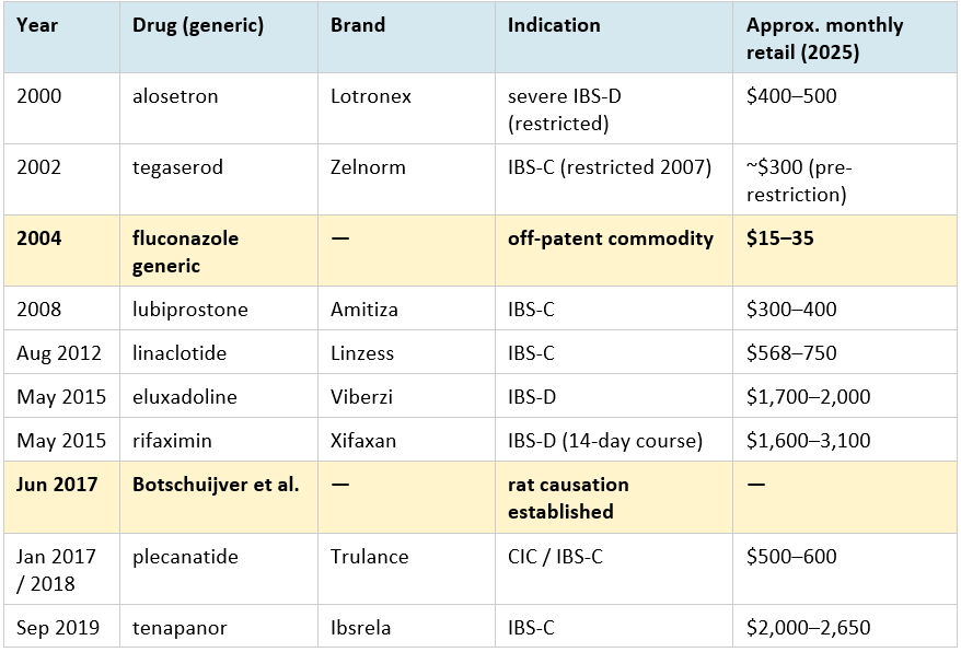 The 2017 causation finding arrived in the middle of the most active period of branded IBS-drug approvals in the history of the indication. Eluxadoline and rifaximin had been approved for IBS-D two years earlier. Plecanatide’s IBS-C indication was approved in January 2018, seven months after Botschuijver. Tenapanor was in late-stage trials. A successful fluconazole-IBS trial in 2017 would have competed directly with every one of these products, and would have done so at a fraction of the per-patient drug cost.